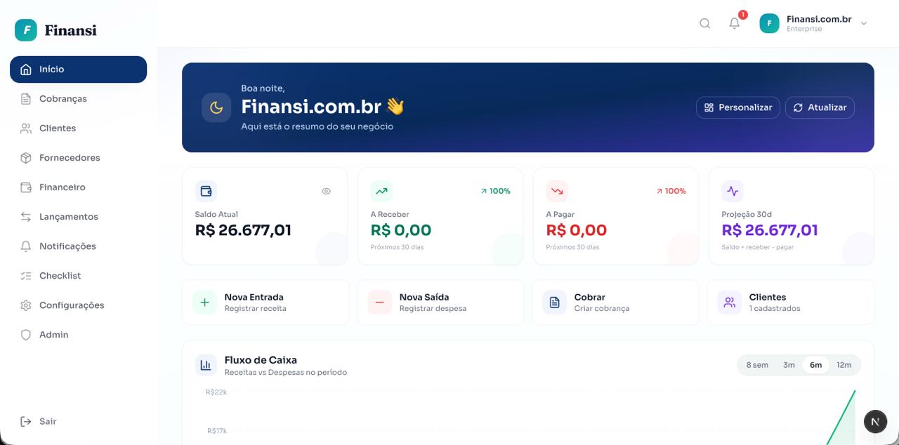 ERPs são feitos para empresas com equipe financeira e exigem semanas de treinamento. O Finansi foi criado para quem quer controlar o caixa sozinho, sem complicação. Se você sabe o que entrou e o que saiu, já sabe usar.